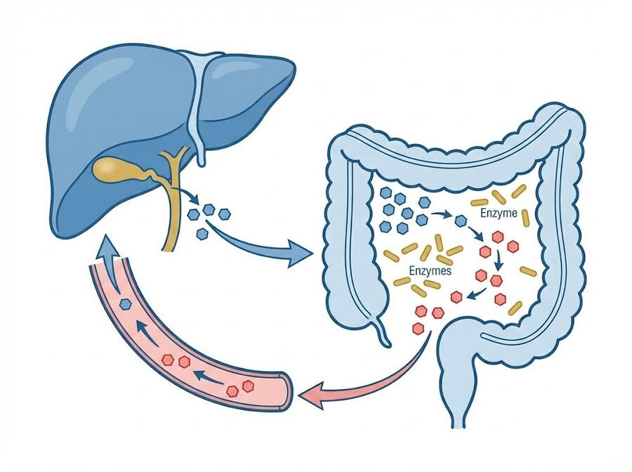 The Problem: The liver excretes estrogens, but specific gut bacteria can "rescue" them before they are lost, recycling them back into the bloodstream.